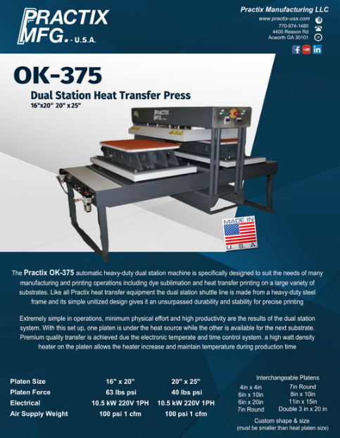 The Practix OK-375 platen machine is specially designed to suit the needs of many types of manufacturing and printing operations including dye sublimation and heat transfer printing on a large variety of substrates. The OK-375 is an automatic heavy-duty dual station press. With its large airbags, the machine is able to print onto materials with decreased dwell times. These presses are perfect for the embossing and printing of rugs, shirt collars, cuffs, and fronts, and more commercial products that require a high level of fusing pressure while maintaining high productivity. Like all Practix heat transfer equipment, the dual station shuttle line is made from a heavy duty steel-forged frame, and its simple unitized design gives it an unsurpassed durability and stability for precise printing.