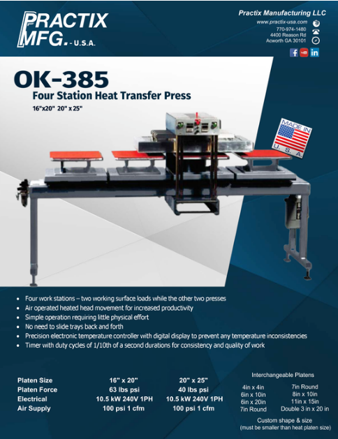 Practix OK-385 platen machines are specially designed to suit the needs of many types of manufacturing and printing operations including dye sublimation and heat transfer printing on a large variety of substrates. The OK-385 is an automatic heavy-duty dual station press. With its large airbags, the machine is able to print onto materials with decreased dwell times. These presses are perfect for the embossing and printing of rugs, shirt collars, cuffs, and fronts, and more commercial products that require a high level of fusing pressure while maintaining high productivity. Like all Practix heat transfer equipment, the dual station shuttle line is made from a heavy duty steel-forged frame, and its simple unitized design gives it an unsurpassed durability and stability for precise printing.