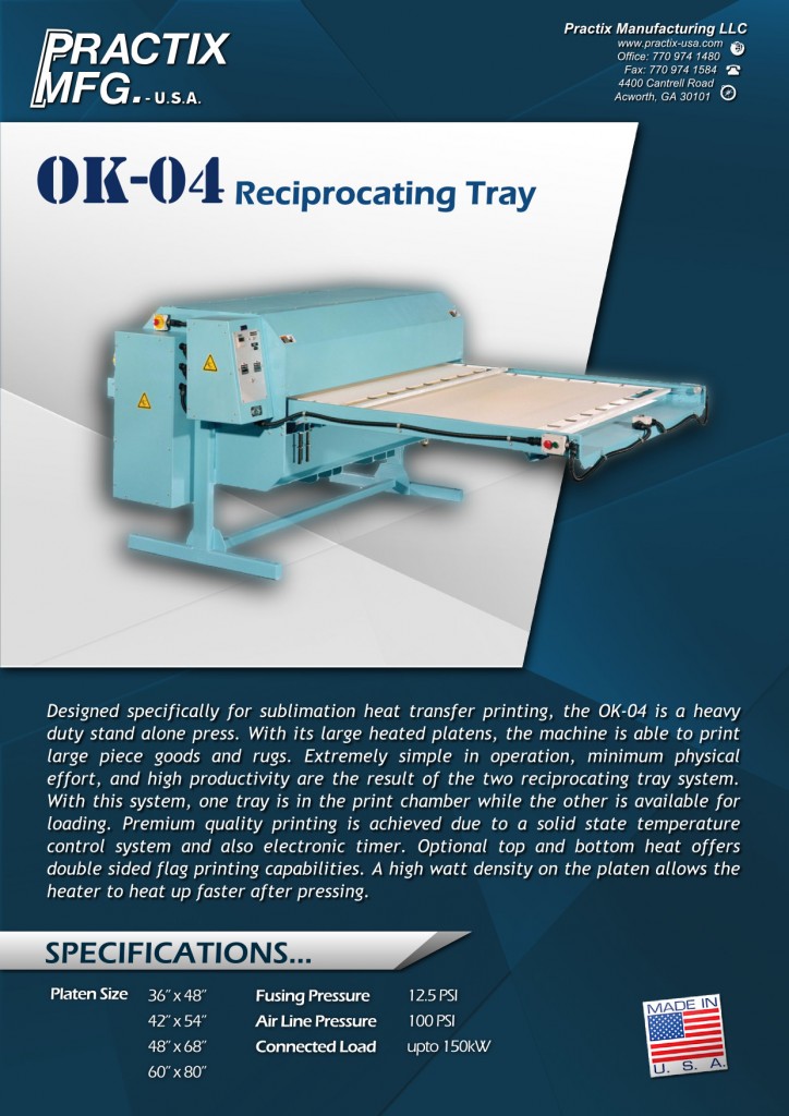Practix OK-04 reciprocating tray machines are specially designed to suit the needs of many types of manufacturing and printing operations including dye sublimation and heat transfer printing on a large variety of substrates. The OK-04 is an automatic heavy-duty dual station press. With its large airbags, the machine is able to print onto materials with decreased dwell times supplying a large amount of pressure. These presses are perfect for the transferring into flags, all over garments, and more products that require a high level of fusing pressure while maintaining high productivity. Like all Practix heat transfer equipment, the reciprocating tray line is made from a heavy duty steel-forged frame, and its simple unitized design gives it an unsurpassed durability and stability for precise printing.