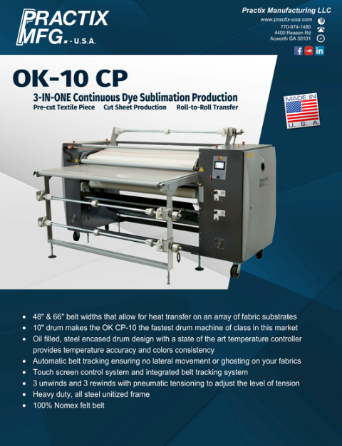 The Practix dye sublimation rotary heat model OK-10CP is available in 48” or 66” wide printable widths. The oil filled heated drum is 10″ (250 mm) in diameter and has 240 degrees of wrap achieving faster production speeds then most comparable models. This model can be used for transferring on continuous or roll materials. This heat transfer machine is small and affordable offering the Practix high quality innovative engineered design using a heavy duty frame, automation, and best quality electrical and pneumatic components like all Practix heat transfer equipment, including sublimation machines, lamination machinery and embossing equipment.