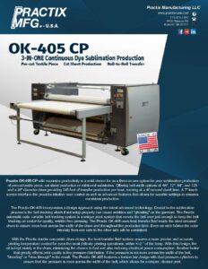 A truly advanced sublimation machine, the OK-405CP from Practix was designed by heat transfer machinery specialists with over 20 years of experience who understand fully the fabric sublimation process. This unique piece of innovative machinery was designed with a pivot system for automatic belt tracking, which ensures no wrinkles and “ghosting” on any of your garments. Also crucial to a quality sublimation machine is even heat. To meet this need and nearly guarantee color intensity across even wide garments, the OK-405CP utilizes a steel encased, oil filled heated drum system.