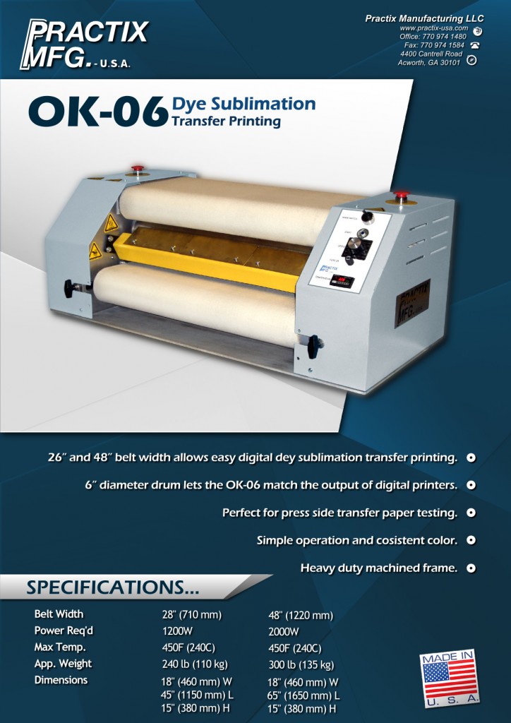 The Practix dye sublimation rotary heat model OK-06 is available in 26” or 48” wide printable widths. The solid state controlled heated drum is 6″ (150 mm) in diameter. This model can be used for transferring on continuous or roll materials. This heat transfer machine is small and affordable offering the Practix high quality innovative engineered design using a heavy duty frame, automation, and best quality electrical and pneumatic components like all Practix heat transfer equipment, including sublimation machines, lamination machinery and embossing equipment.
