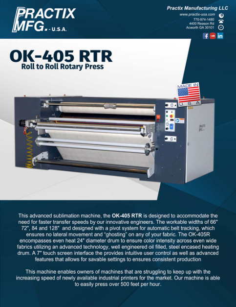 One of the most innovative names in sublimation equipment, Practix offers the unmatched OK-405RTR that was specifically designed to print narrow web fabrics and plastics from a roll. This machine provides steel encased, oil filled heated drum, producing constant and even color transfer for high-speed, continuous fabric sublimation. Includes belt sizes from 24” to 72” and multiple lanes for your narrow web substrate and printed transfer paper hot off the flexo, gravure, offset or the increasingly popular digital press. The OK-405RTR puts together decades of engineering and design expertise for the most efficient continuous belt sublimation machinery on the market. The unique Practix channel tracking technology keeps the belt centered on the large 24” diameter drum, avoiding costly delays. Furthermore, the dual unwind system allows the loading of more paper without stopping. This keeps the job rolling as long as you need and saves you valuable time and money.