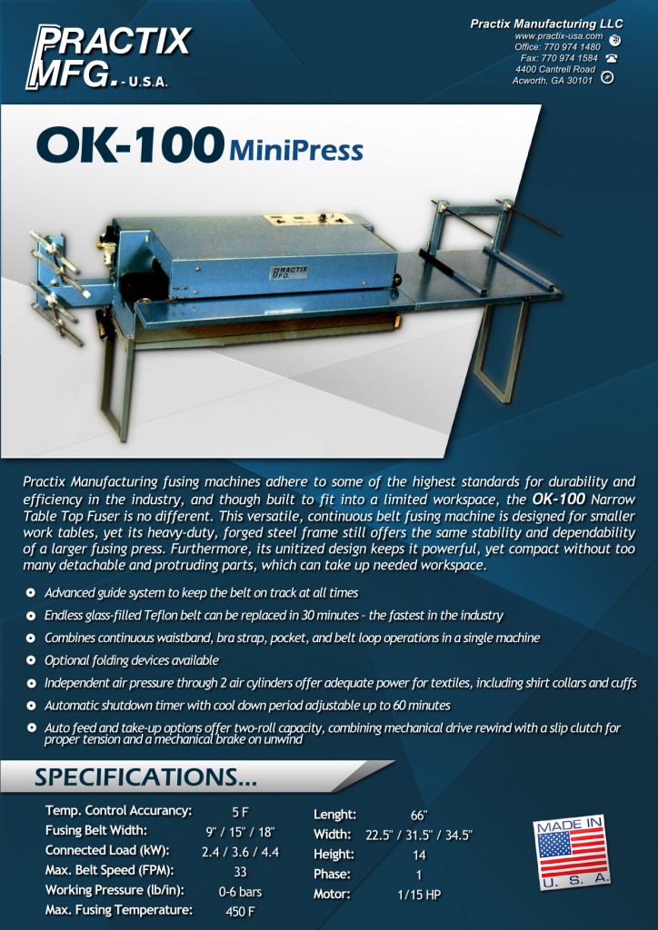 Practix Manufacturing fusing machines adhere to some of the highest standards for durability and efficiency in the industry, and though built to fit into a limited workspace, the OK-100 Narrow Table Top Fuser is no different. This versatile, continuous belt fusing machine is designed for smaller work tables, yet its heavy-duty, forged steel frame still offers the same stability and dependability of a larger fusing press. Furthermore, its unitized design keeps it powerful, yet compact without too many detachable and protruding parts, which can take up needed workspace.