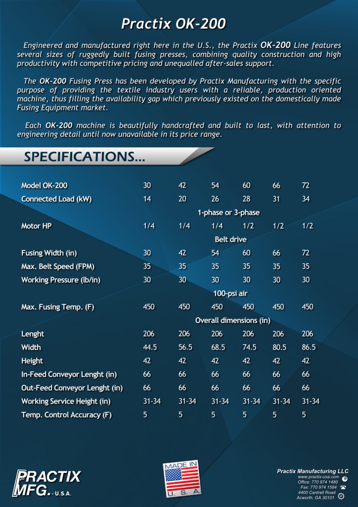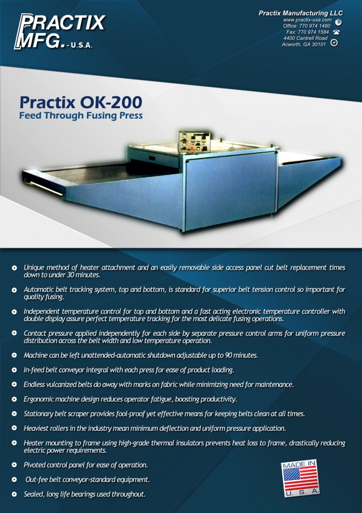 Engineered and manufactured right here in the U.S., the Practix OK-200 Line features several sizes of ruggedly built fusing presses, combining quality construction and high productivity wit competitive pricing and unequalled after-sales support. The OK-200 Fusing Press has been developed by Practix Manufacturing with the specific purpose of providing the textile industry users with a reliable, production oriented machine, thus filling the availability gap which previously existed on the domestically mad Fusing Equipment market. Each OK-200 machine is beautifully handcrafted and built to last, with attention to engineering detail until now unavailable in its price range.