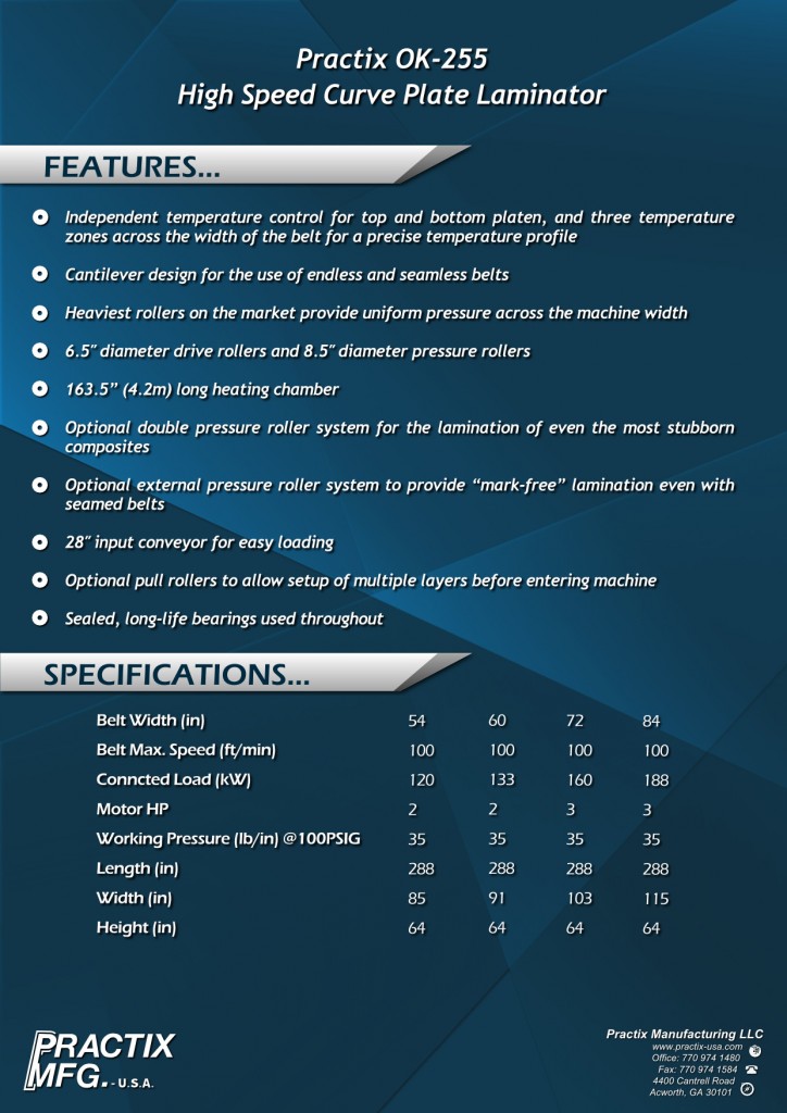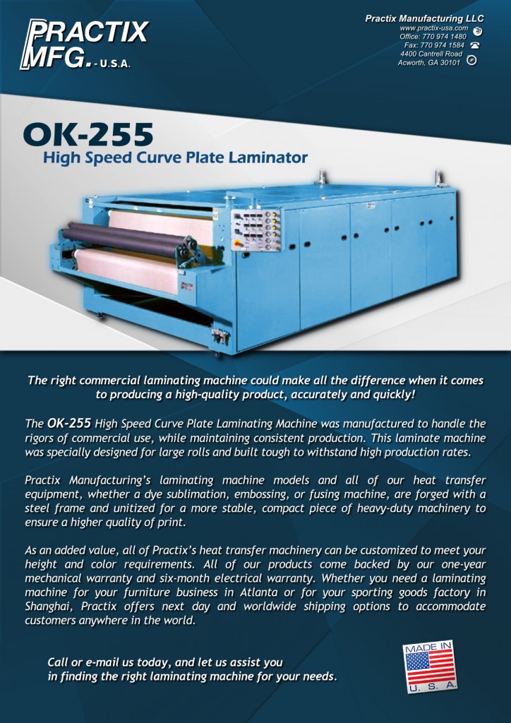 The right commercial laminating machine could make all the difference when it comes to producing a high-quality product, accurately and quickly. The OK-255 High Speed Curve Plate Laminating Machine was manufactured to handle the rigors of commercial use, while maintaining consistent production. This laminate machine was specially designed for large rolls and built tough to withstand high production rates.